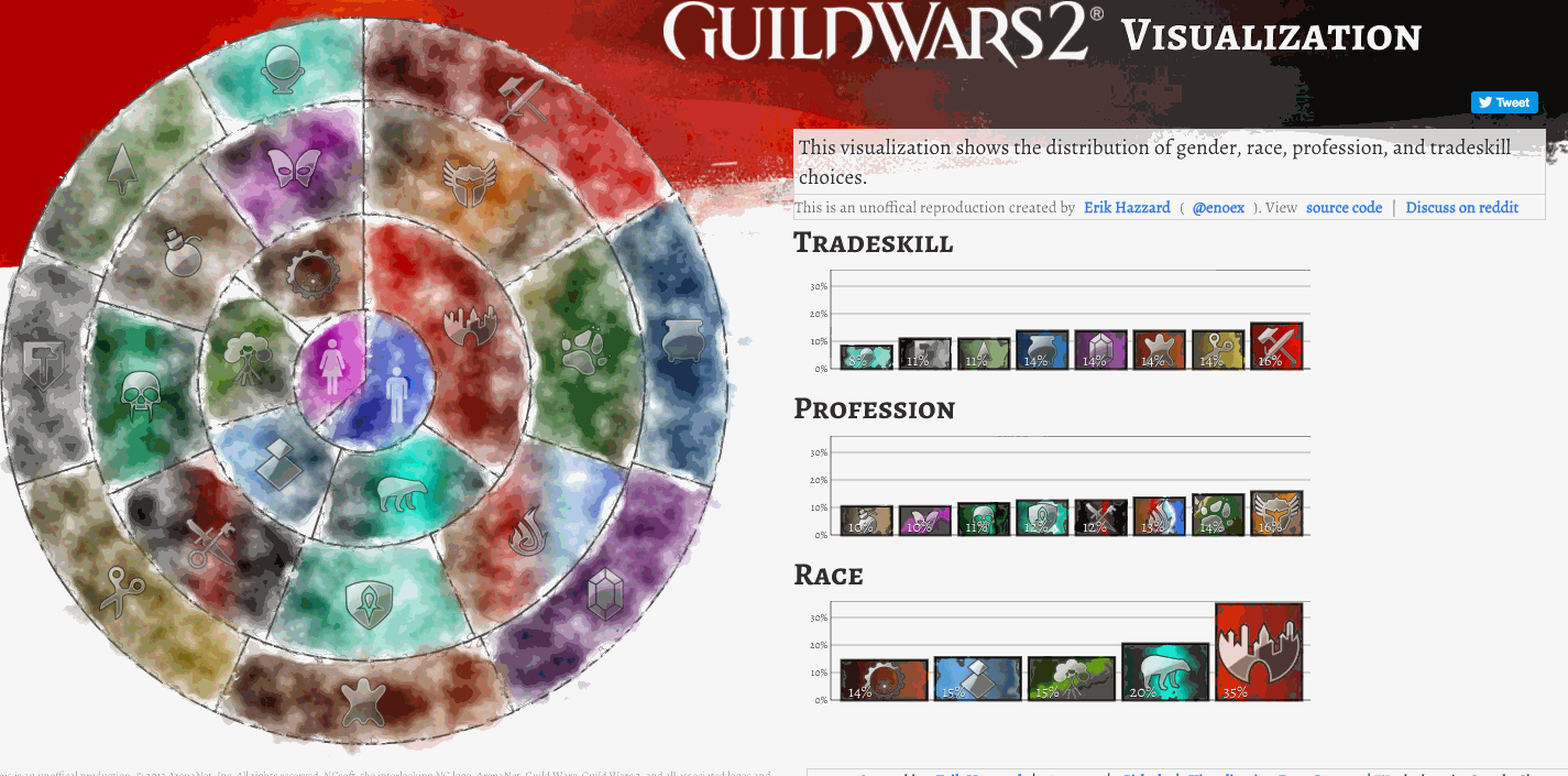 The ending result, an interactive visualization of player demographics at GuildWars2Viz.com , was featured in a number of Guild Wars related websites and viewed over 100,000 times.