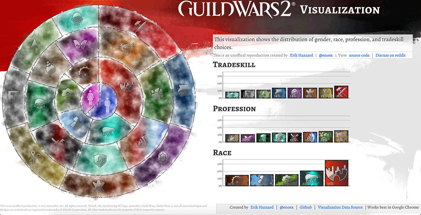 Overall, I am happy with the result. I was successfully able to create chart junk and spark discussions and interest in data viz among a wide audience. Many Guild Wars fan sites included a screenshot of the page which featured only the donut charts, as it a more compelling and sharable hook. Its virality and discussions around it within the Guild Wars 2 community lends credence towards the notion that a strong hook can be more engaging than a traditional visualization. The final result can be found at GuildWars2Viz.com.