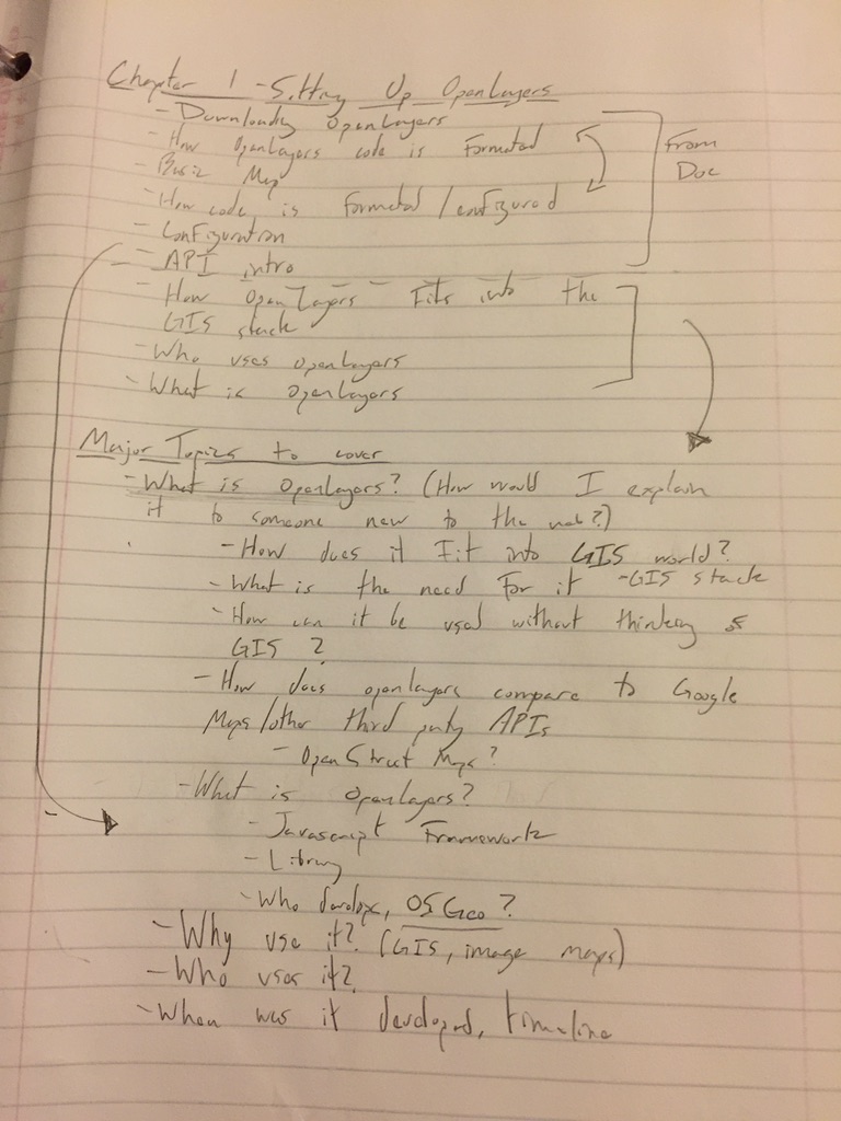 Before I started any writing, I outlined everything. I took a very top-down approach; I specified every concept the book would cover and how they wove into each other. This was an iterative process that took a little over a month. I started by mapping out OpenLayers specific concepts I wanted to communicate.