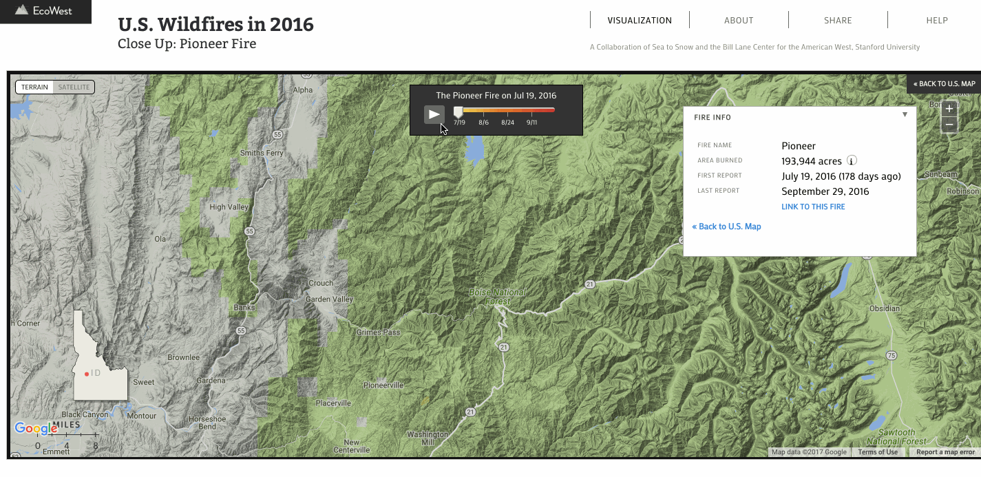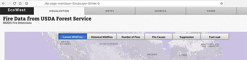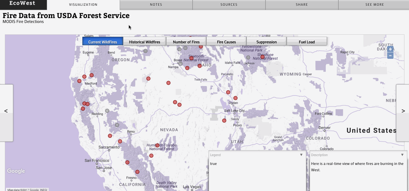The framework allows users to step between interactive layers - whether they be map components or visualization components. Information boxes are laid on top of the view to provide context and a narrative backbone. Some individual layers also have their inner exploration layers, such as a map layer showing wildfire spread over time, which fits into a larger narrative about wildfires. Switches in interactivity are all exposed through an event system that can be listened to or triggered for even more custom functionality.